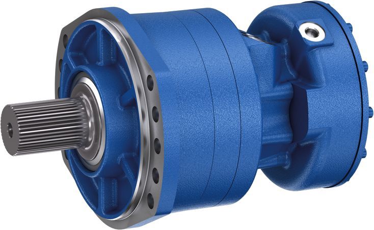 滑移装载机/铲运车用进口行走马达售后备件,低转速高扭矩的链轮驱动输出轴,双排同步驱动,配置机械驻车制动器和闭式系统的热交换阀组,CNH设备专用原装进口油压马达 ,链轮驱动轴 双排结构同步驱动,配置机械刹车制动器。